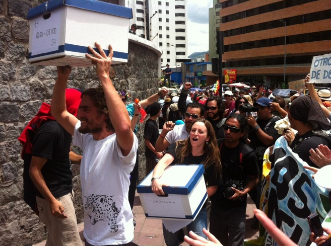 No fue sino hasta el 15 de agosto de 2013, que Correa se quitó la máscara y mostró a lxs jóvenes su verdadera cara extractivista. Ese mismo día nace YASunidos, colectivo de jóvenes ecologistas que desafiamos al régimen e intentamos inaugurar nuestros derechos de participación política a través de un mecanismo de democracia directa para convocar a una consulta popular desde la ciudadanía y dar la oportunidad a todxs lxs ecuatorianxs para decidir sobre la explotación del Yasuní.