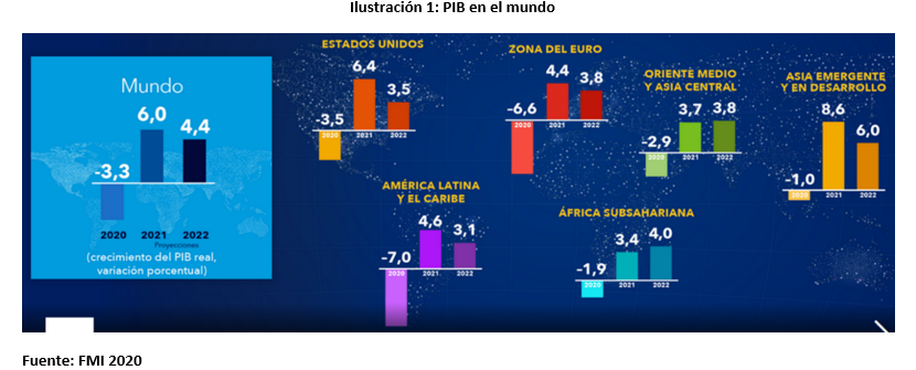 El Producto Interno Bruto (PIB) del mundo se recupera de una fuerte caída, mientras el de Latinoamérica crece menos. Los datos pronosticados en 2020 no han variado, incluso con el avance la vacuna para la Covid-19. El PIB de Estados Unidos con 6,8% hasta noviembre de 2021 supera el nivel pronosticado de 6,4%.