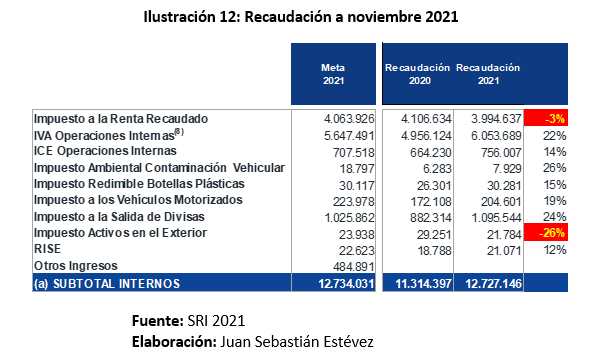 Sin embargo, en los ingresos tributarios, la recaudación se ha recuperado y seguramente cerrará el año superando la meta de 14 mil millones, pero siguen siendo los impuestos indirectos como el IVA quienes más aportan en relación con los impuestos directos como el de la Renta, tal como recomiendan las buenas prácticas para generar equidad y redistribución del ingreso. Hasta la fecha se siente la menor recaudación del IVA debido a la reducción de transacciones producto de la recesión de la economía. Para el 2022, con una economía en recuperación, no será difícil alcanzar las metas.