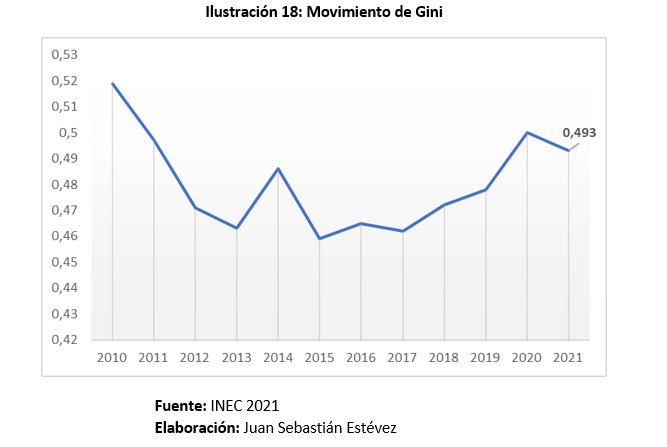 El coeficiente de Gini aumentó por las secuelas de la pandemia de la Covid-19. La expansión de la asistencia social mitigó la aumentó la desigualdad y redujo el coeficiente de Gini a 0,493 en 2021; sin embargo, es el más alto nivel de desigualdad desde hace 6 años.