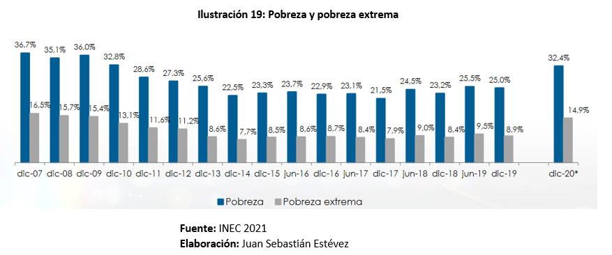 De igual manera, la pandemia y sus secuelas han empujado a alrededor de 1,5 millones de personas a la pobreza, esto es familia que viven con menos de USD 84,06 al mes. Pobreza extrema también se incrementó y son familias que viven con menos de USD 47,37 al mes.