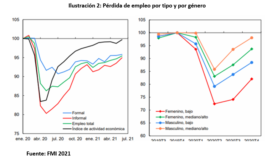 Dentro de los impactos en la economía de Latinoamérica, los organismos económicos internacionales coinciden en que el empleo formal cayó alrededor de 6,2%. El empleo informal fue el más afectado y se recupera más lento. La recuperación es dispar dentro de cada país, ya que los más afectados son los trabajadores jóvenes, los menos calificados y las mujeres.
