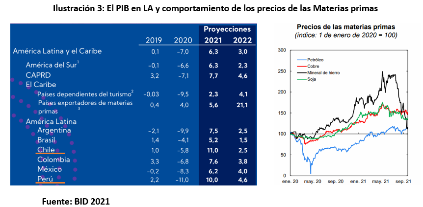 En la ilustración 3 se evidencia un rápido crecimiento en Chile y Perú, impulsados por el consumo privado y la inversión. Así como también, se presentan algunas medidas recomendadas, entre ellas: incentivar el consumo, propiciar la inversión pública y privada, capacitar y estimular al empleo adaptados a la nueva realidad y direccionar subsidios a los sectores de mayor impacto.