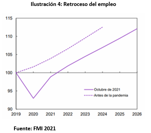 Hablar de postpandemia para el 2022 es muy optimista, más bien se debería hablar de un año en que se lidia con la pandemia en mejores condiciones y se adapta la vida con la presencia del virus. En estas condiciones, Latinoamérica no lograría reactivar su economía sobre todo en aquellos países donde se privilegie lo fiscalista y se margine la inversión, el subsidio y el empleo. No hay que perder de vista que la pobreza retrocedió a los niveles de los últimos 8 años, por lo que en general, incluso en las mejores condiciones se necesitaran al menos 6 años para volver al nivel de la economía de 2019, como se puede observar en la Ilustración 4.